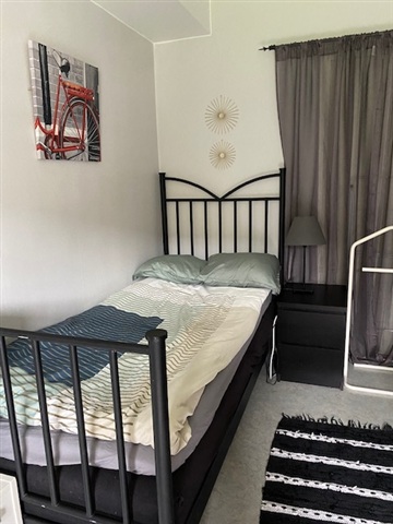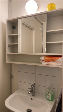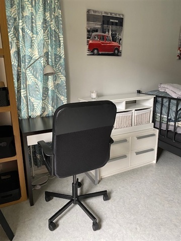The room has most of the furniture you need, and there is plenty of space in shelves and dressers. You have your own fridge and freezer in the kitchen, your own shelves in the kitchen and in some drawers.