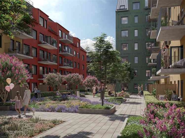 This modern one-bedroom apartment, completed in 2026, features a balcony and partial sloped ceilings equipped with skylights. The kitchen is outfitted with sand-colored cabinet doors from Marbodal and stainless steel appliances, including an induction cooktop, a built-in oven, a dishwasher, a microwave, as well as a full refrigerator and freezer. The walls throughout the unit are painted in a warm, light tone. The bathroom includes tiled walls and a tiled floor, with a shower area enclosed by glass walls, along with a washing machine and a tumble dryer. Oak parquet flooring runs through the apartment except in the hallway and bathroom, where tile flooring is used. Storage space is also available within the apartment itself. The building operates with individual measurement and billing for hot water consumption. Additionally, there is a guest apartment that residents can reserve for overnight visitors.Merparten av hyresvärdens lägenheter kan ingå i ett kösystem baserat på köpoäng